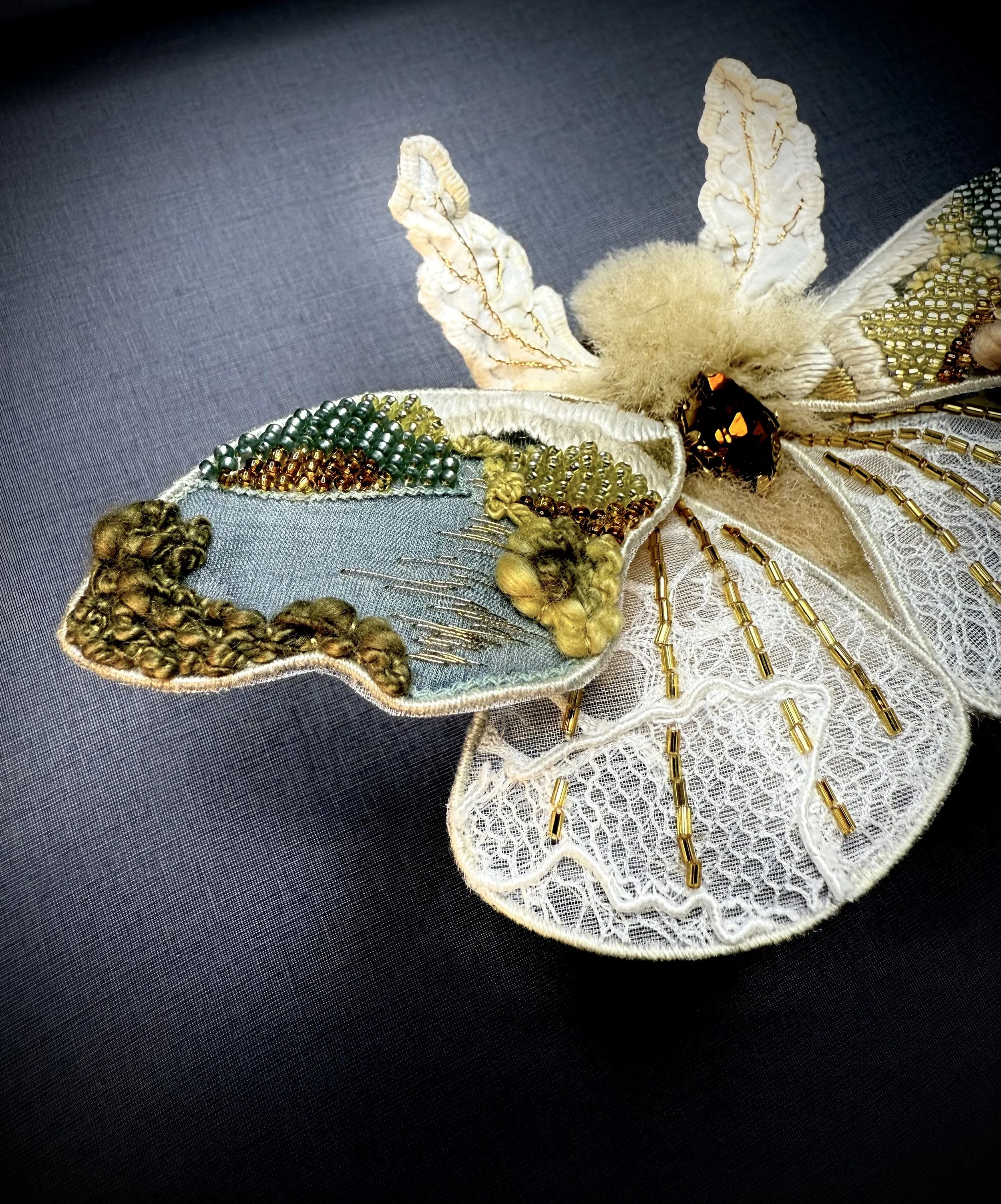 She is recognized within the embroidery community for Palingenesis, her fantastical moth sculpture, which won the Hand & Lock Prize 2022. The piece embodies the evolving potential of embroidery as both material and medium for storytelling.