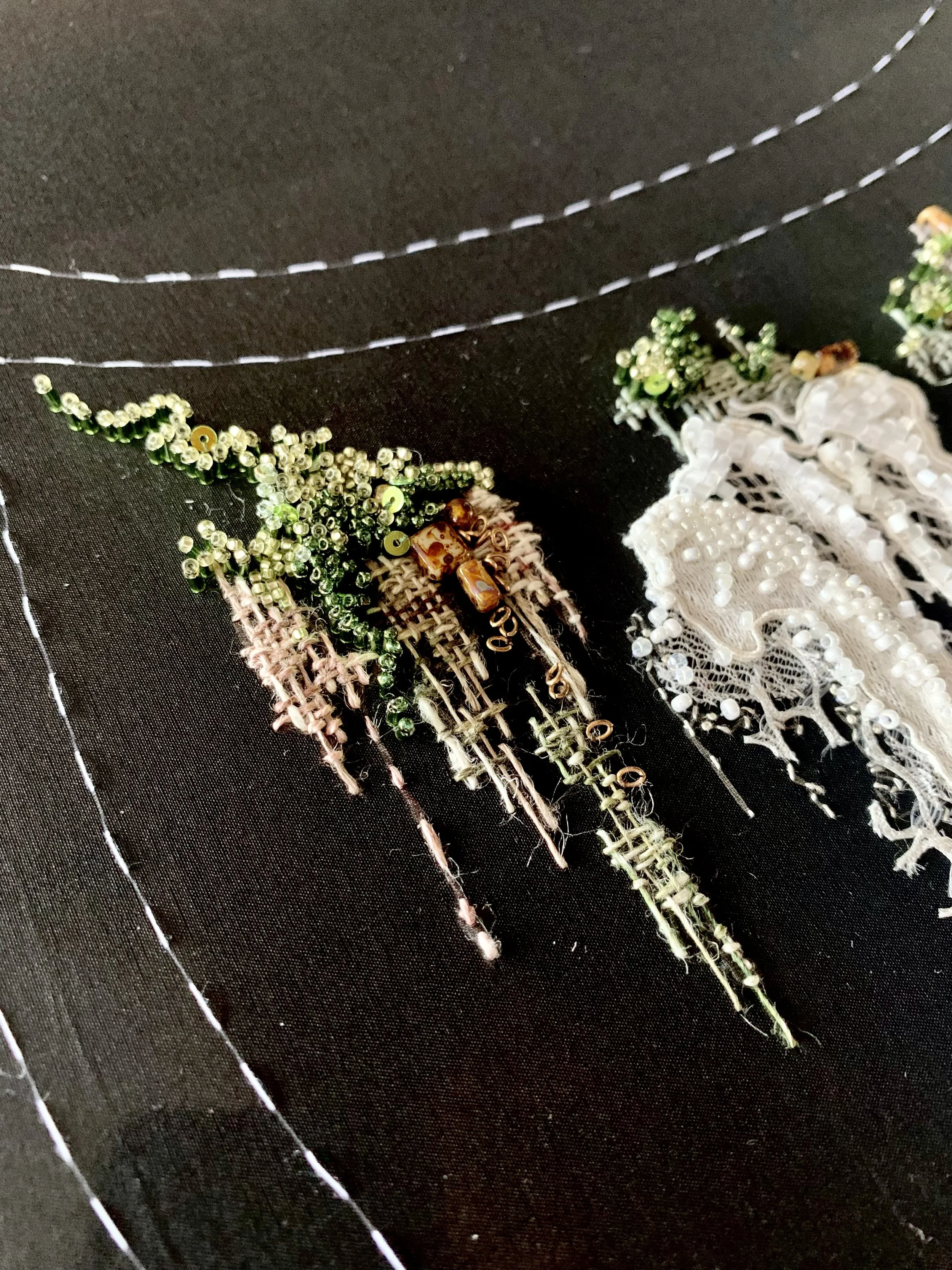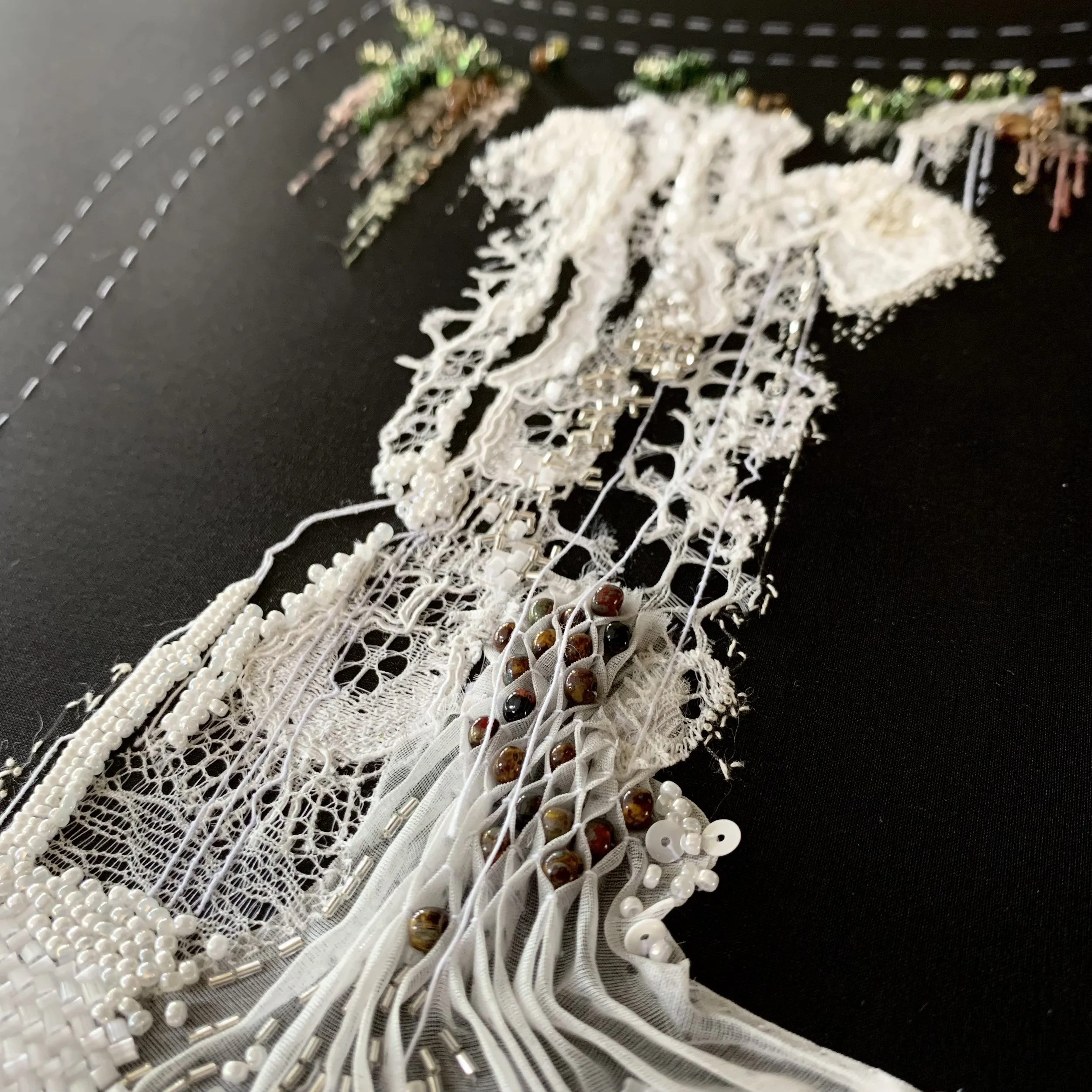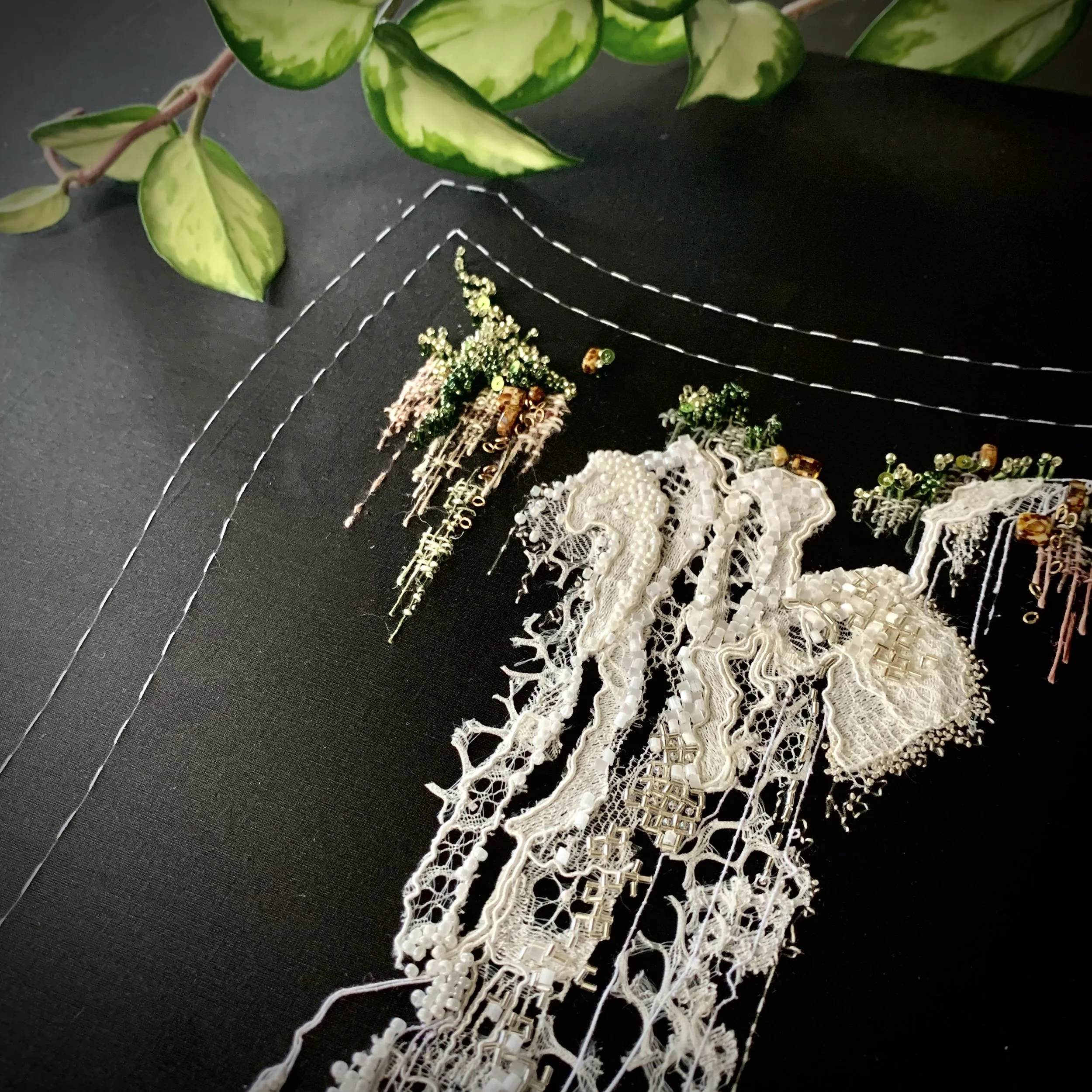 To capture the depth and movement of water, the cascade was constructed using carefully chosen pre-loved appliqué lace on black silk organza. Different lace textures create shifting volumes of water, while beads highlight areas of depth, power, and flow. Beaded smocking suggests water weaving around stones before gathering strength again. The waterfall descends into a jewelled pool, where the direction of each bead shifts to evoke the glimmer of still water and a sense of purity. Surrounding foliage and rock-like textures anchor the piece within an imaginative, dreamlike landscape.